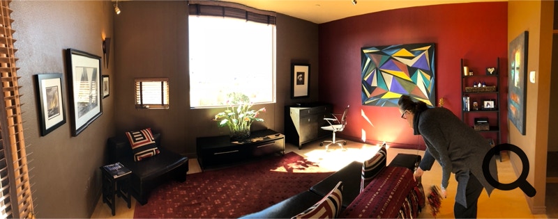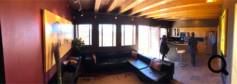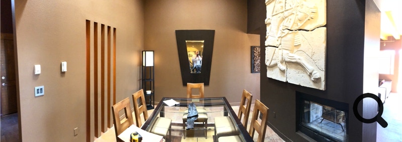 Panorama shot of Dining Room. Don’t look closely in mirror. Front door is just showing on the left
